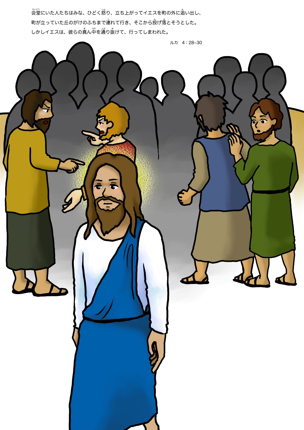 しかしイエスは、彼らの真ん中を通り抜けて、行ってしまわれた。(新改訳聖書 ルカ 4:28–30)