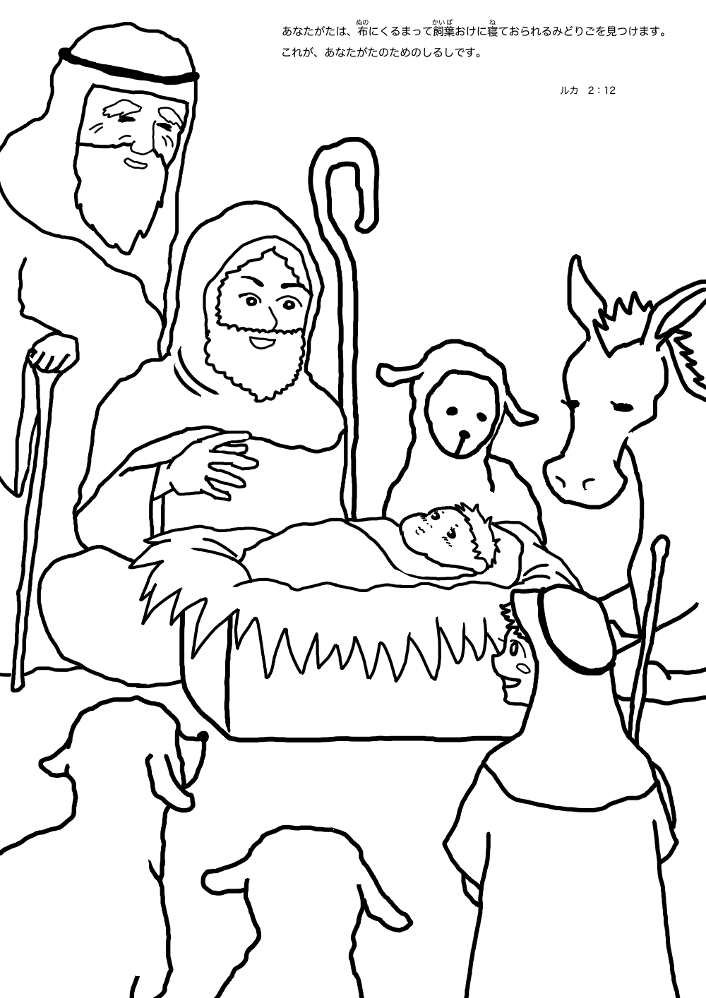 イラスト・ぬりえ羊飼いの礼拝 イラストをダウンロード ぬりえをダウンロード あなたがたは、 布にくるまって飼葉おけに寝ておられるみどりごを見つけます。 これが、あなたがたのためのしるしです。 (新改訳聖書 ルカ 2:12) シェアする