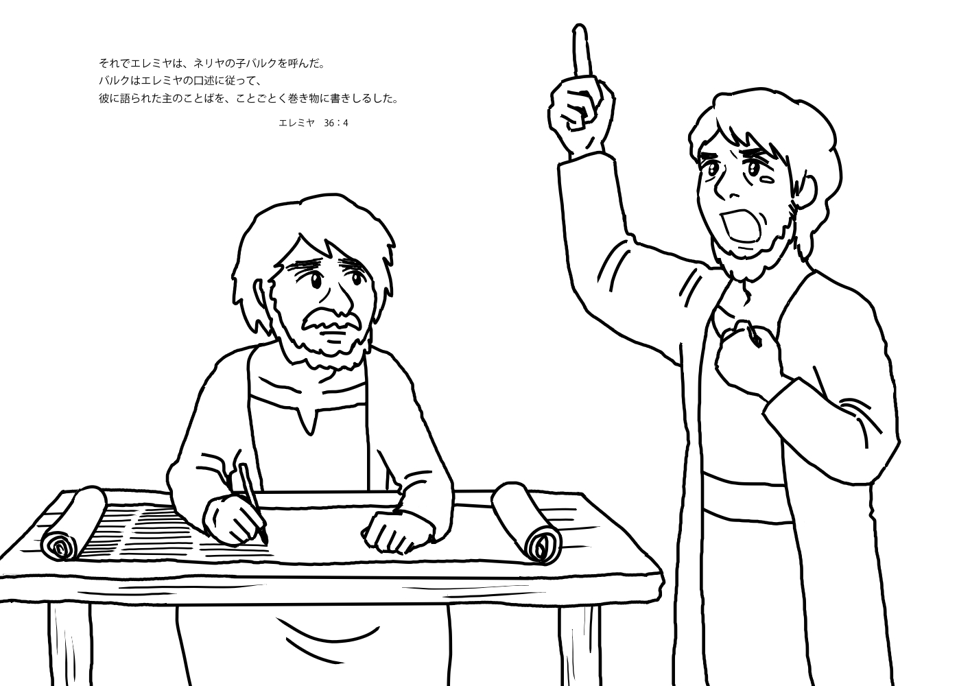 イラスト・ぬりえエレミヤとバルク イラストをダウンロード ぬりえをダウンロード それでエレミヤは、ネリヤの子バルクを呼んだ。 バルクはエレミヤの口述に従って、 彼に語られた主のことばを、ことごとく巻き物に書きしるした。 (新改訳聖書 エレミヤ書 36:4) シェアする