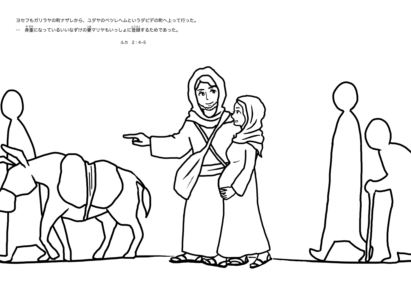 聖霊によって神の御子を宿したマリヤを、ヨセフは迎え入れて結婚しました。もうすぐ赤ちゃんが生まれそうだという頃、二人はベツレヘムへ旅をすることになりました。