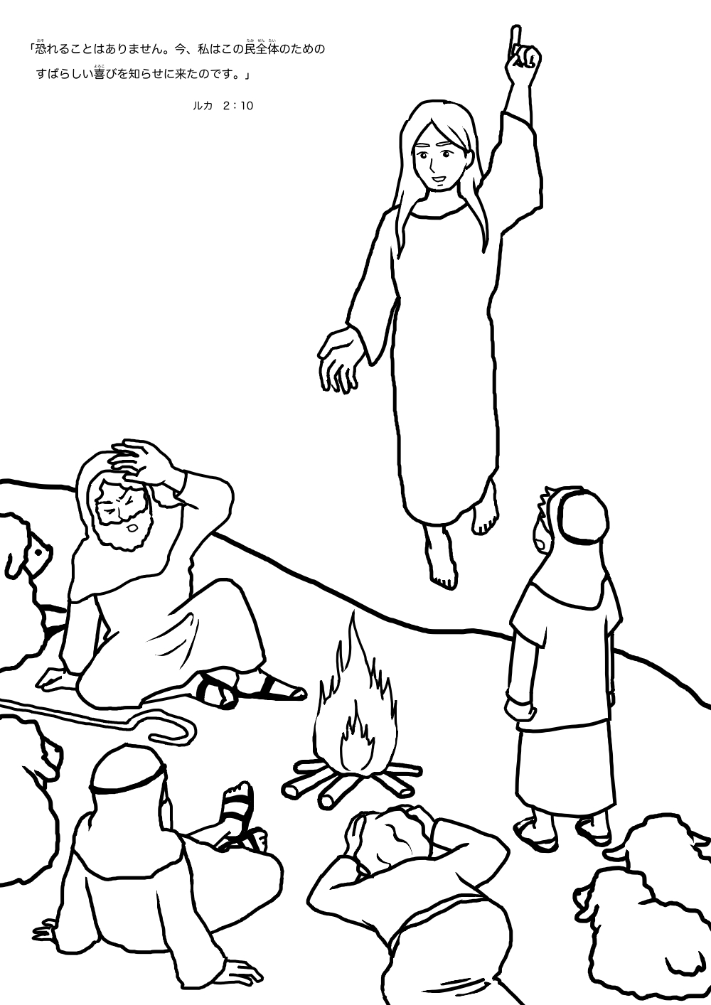 その羊飼いたちのところに、突然主の使いがやって来ました。彼らの回りを、主の栄光がまぶしく照らしました。あまりに凄まじい光景に、彼らはみなひどく恐れました。しかし、御使いは言いました。