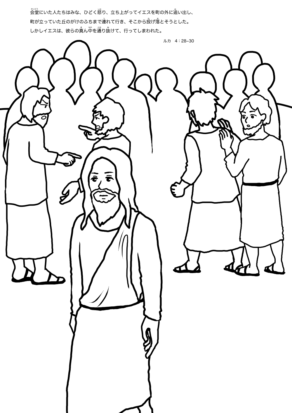 はああぁぁあ!? 何ふざけたこと言ってんだ大工の子!…聞いていた人たちは怒り狂い、イエスを痛めつけてやろうと町はずれのがけっぷちまで引っぱって行きました。そこから下に投げ落とすつもりです。