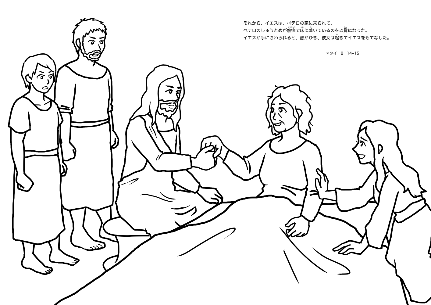 ペテロは結婚していました。しゅうとめとはおくさんのお母さんです。ある時イエスさまは、弟子をつれてペテロの家に入られました。ところが家の中では、しゅうとめが高い熱を出して寝込んでいたのです。イエスは彼女の枕もとに来られると、その手を取り、熱をしかりつけながら、彼女を起こしました。するとすぐに熱がひいてしまいました。やっと起き上がれるようになった..という感じではありません。しゅうとめはサッと立ち上がり、イエスさまたちをおもてなしする用意を始めたのですから。[1]