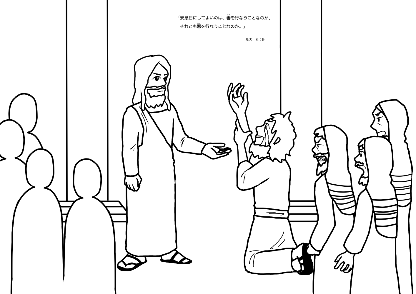 その後、また別の安息日。イエスは会堂で教えていらっしゃいました。聴いている人々の中に、右手が動かなくなっている男がいました。パリサイ人たちは、イエスの様子をじっと見ていました。もしも安息日にイエスが彼の手を治したら、律法違反で訴えることができるから!