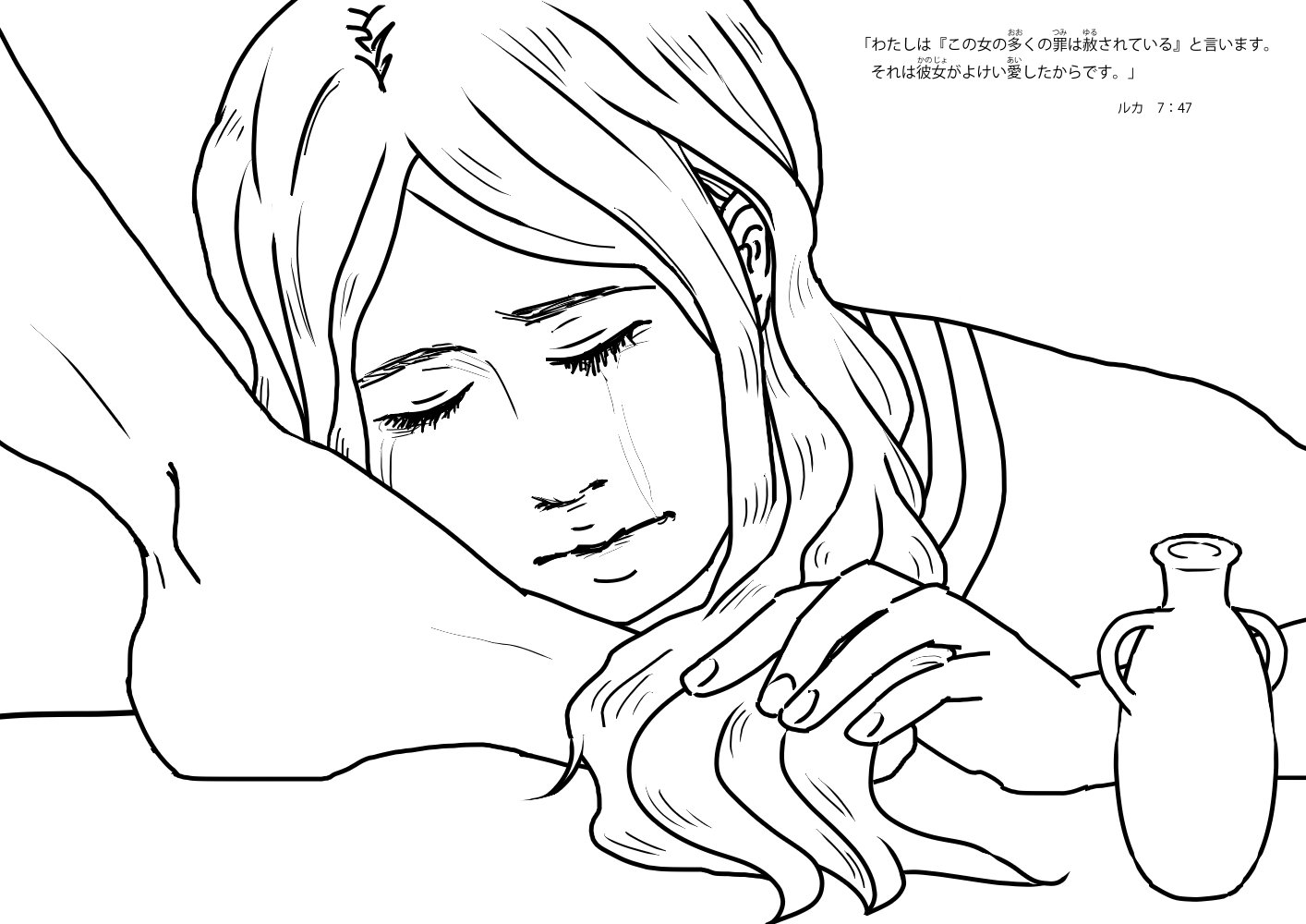 しかしイエスは、ひとつのたとえを語ると、シモンにこうおっしゃいました。彼女がわたしにしてくれたことは、すべてあなたがわたしにしてくれなかったことです…