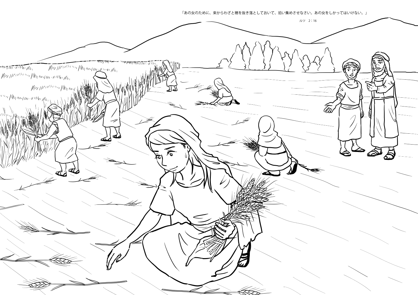 「まあ、ナオミじゃないの!」町の人々は皆わいわいと集まって来てくれましたが、みじめな帰郷にナオミは本当にがっくりしていました。ルツはそれを見て、自分ががんばらなきゃ!と思ったのでしょう。誰かの畑で落ち穂を拾わせてもらってきますと言って、出かけて行きました。麦の刈り入れの時、刈った穂がパラパラとこぼれるのを、貧しい人たちに拾わせてあげなさい…と律法に書いてあるのです(レビ 19:9–10)。姑と自分の食料調達をしに行ったのですね。